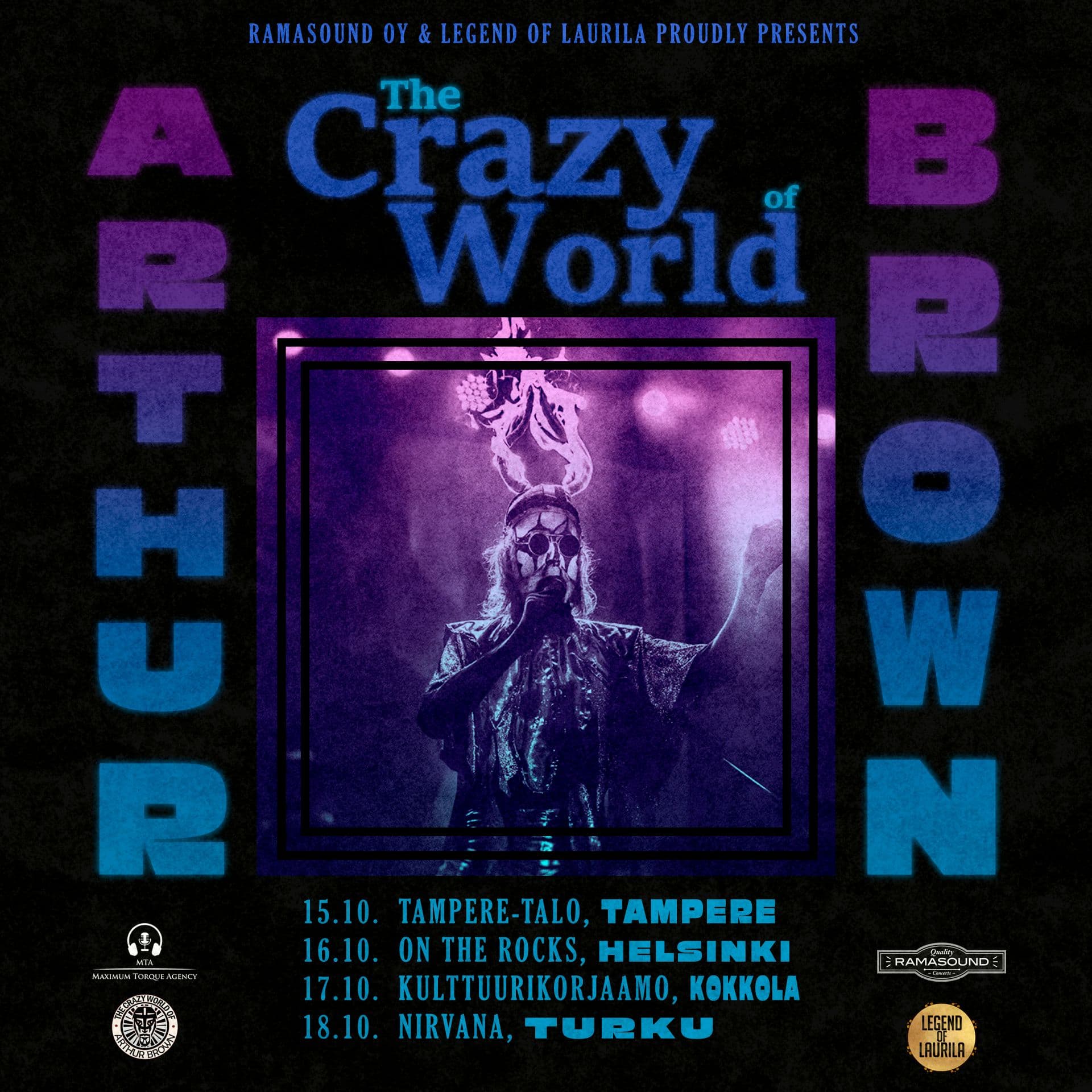 Erityisesti ”Fire” klassikkokappaleestaan sekä näyttävästä lavashowstaan tunnettu brittimuusikko Arthur Brown saapuu lokakuussa Suomeen. The Crazy World of Arthur Brown -yhtyeensä kanssa esiintyvä rock-pioneeri nähdään Tampereella, Helsingissä, Kokkolassa ja Turussa. Vuonna 1968 debyyttialbuminsa julkaisseella Brownilla on ollut merkittävä vaikutus raskaan rockin historiaan. Voimakkaiden kasvomaskien ja liekehtivän kypärän kanssa esiintyvän Brownin teatraalinen lavashow on toiminut inspiraationa niin David Bowien, Kissin kuin King Diamondinkin esiintymisiin. Musiikillisesti Brownin psykedeelistä rockia, soulia, bluesia ja progea yhdistelevät albumit ovat oleellisesti vaikuttaneet hevimusiikin kehitykseen, erityisesti Brownin laaja-alaisen, oopperamaisen äänen ansiosta.